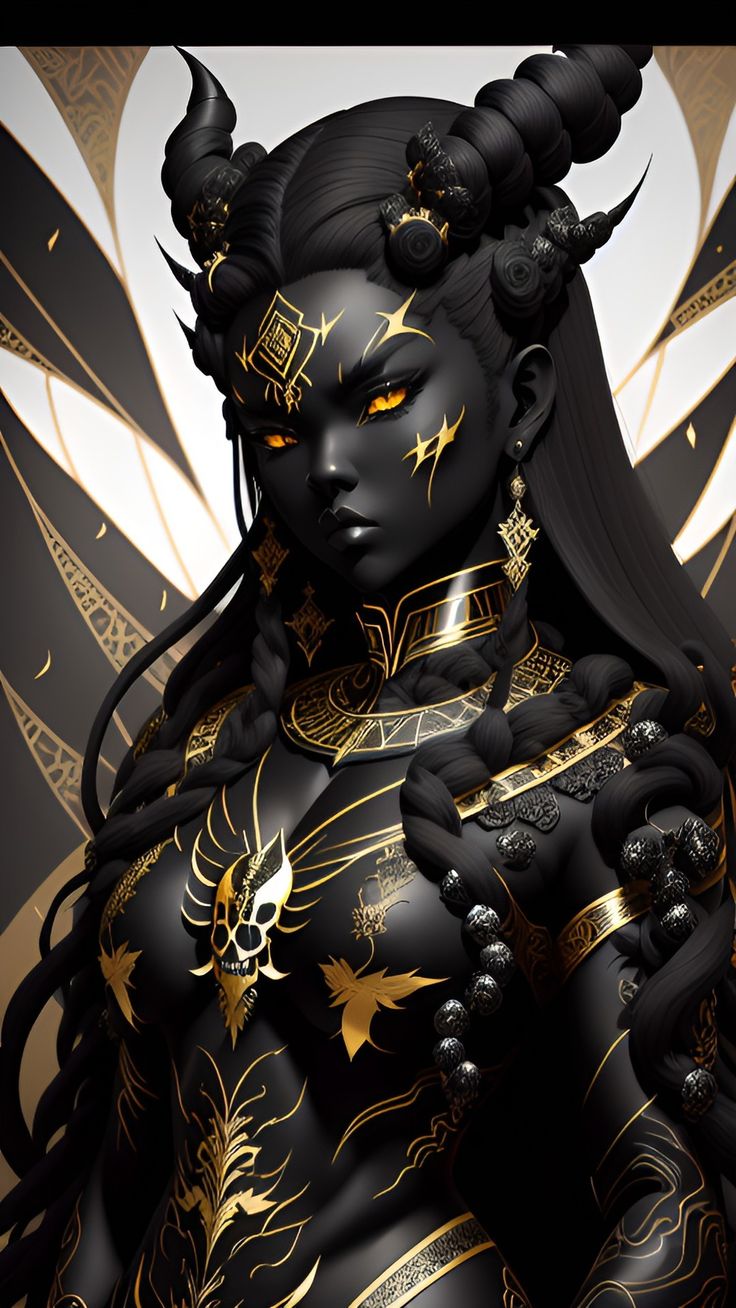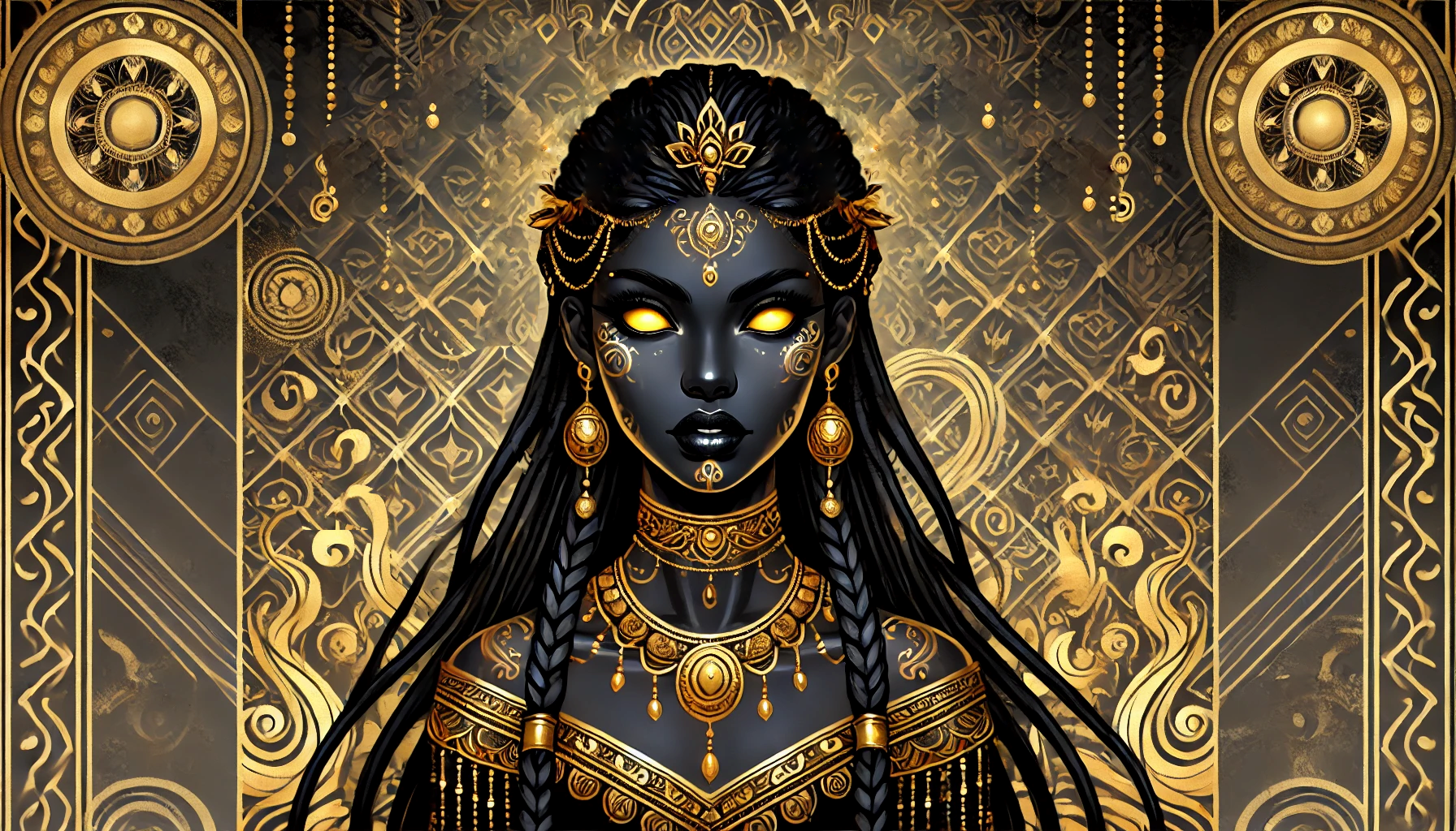 Em um pequeno lago, com menos de 10 metros de diâmetro, estava a dona da voz. Ao centro, em uma ilhota minúscula, havia uma figura de beleza inigualável. Um espírito de pele negra como obsidiana, com tatuagens e adornos dourados que reluziam à luz do amanhecer. Seu corpo parecia esculpido em mármore, com cada curva moldada à perfeição.